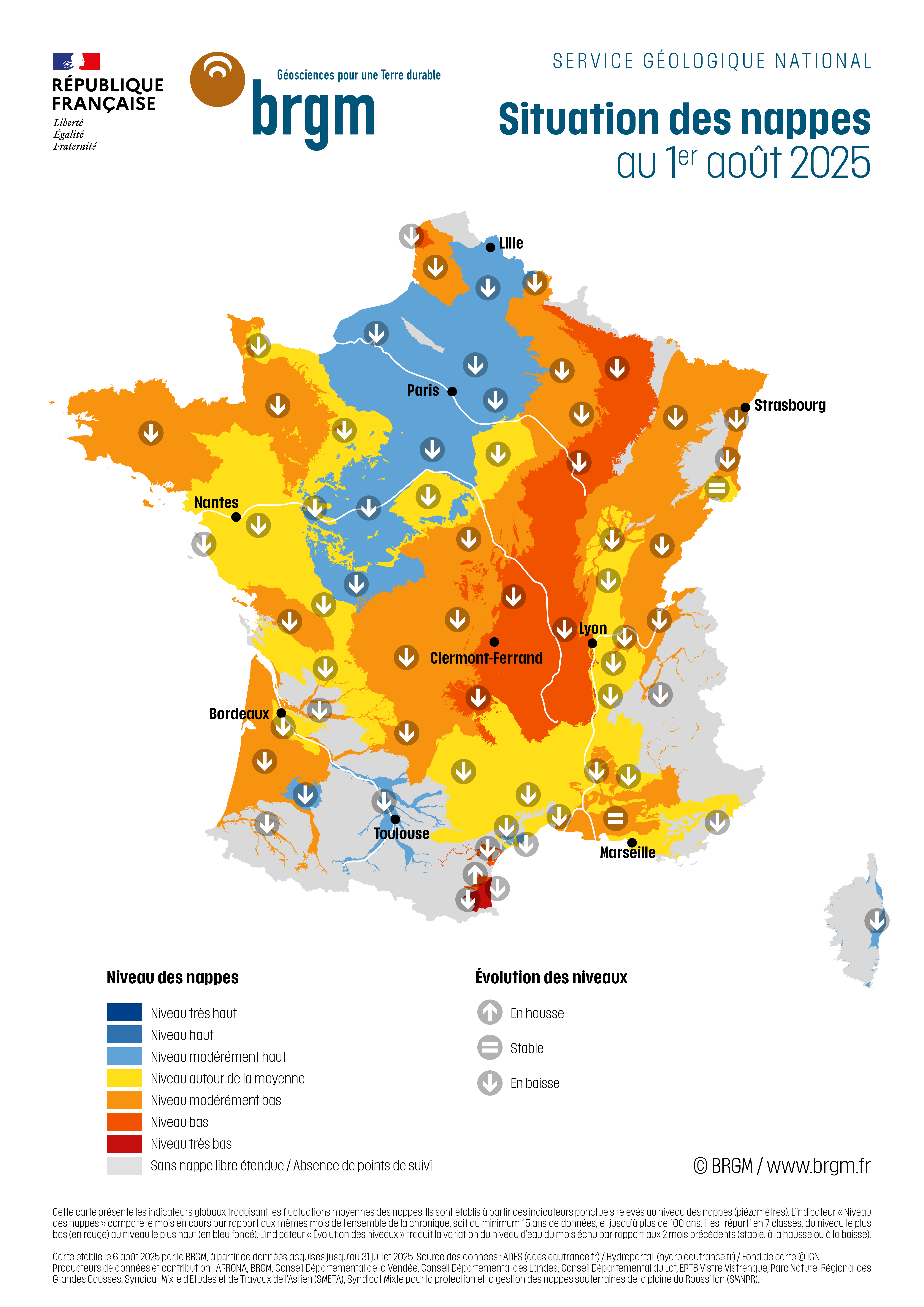 Fil d'Ariane Accueil Actualité Situation des nappes - Bulletin de situation hydrologique du 1er août 2025 Actualité Situation des nappes - Bulletin de situation hydrologique du 1er août 2025 Bulletin de situation hydrologique (BSH) 11 août 2025 Situation des nappes au 1er août 2025 Consulter le BSH complet Consulter l'article du BRGM Situation des nappes au 1er août 2025 (PDF, 492 Ko)